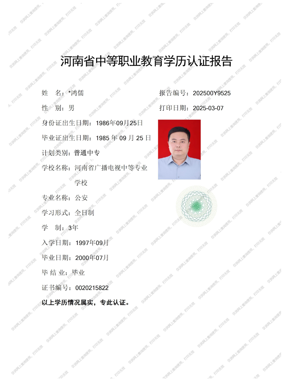 说明:根据《河南省教育厅办公室关于印发河南省中等职业教育学历认证工作规程(试行)的通知》(教职成函〔2020〕312号)文件规定,认证结论分为通过认证和未通过认证两种。 通过认证的申请,申请人获得“河南省中等职业教育学历认证报告”,报告具有唯一编号;未通过认证的申请,申请人获得“河南省中等职业教育学历查询报告”。